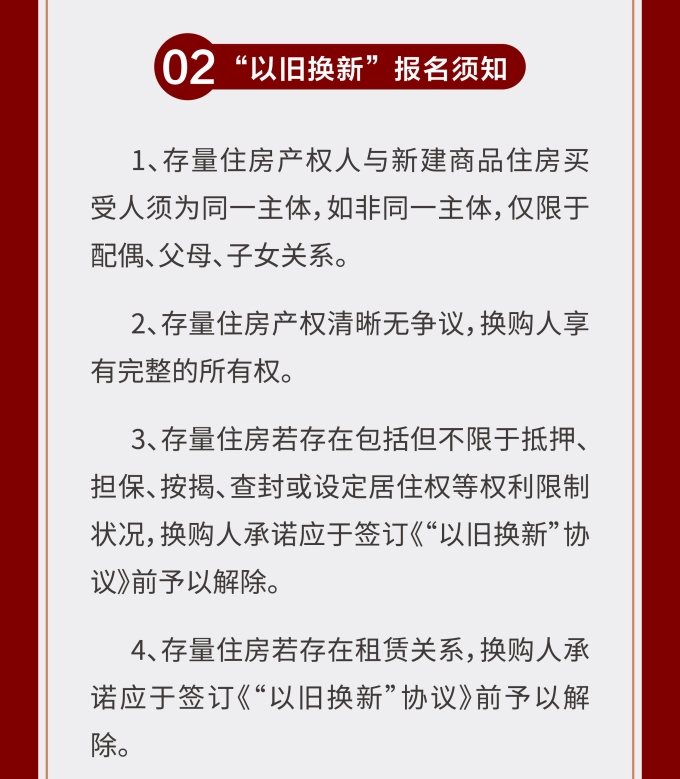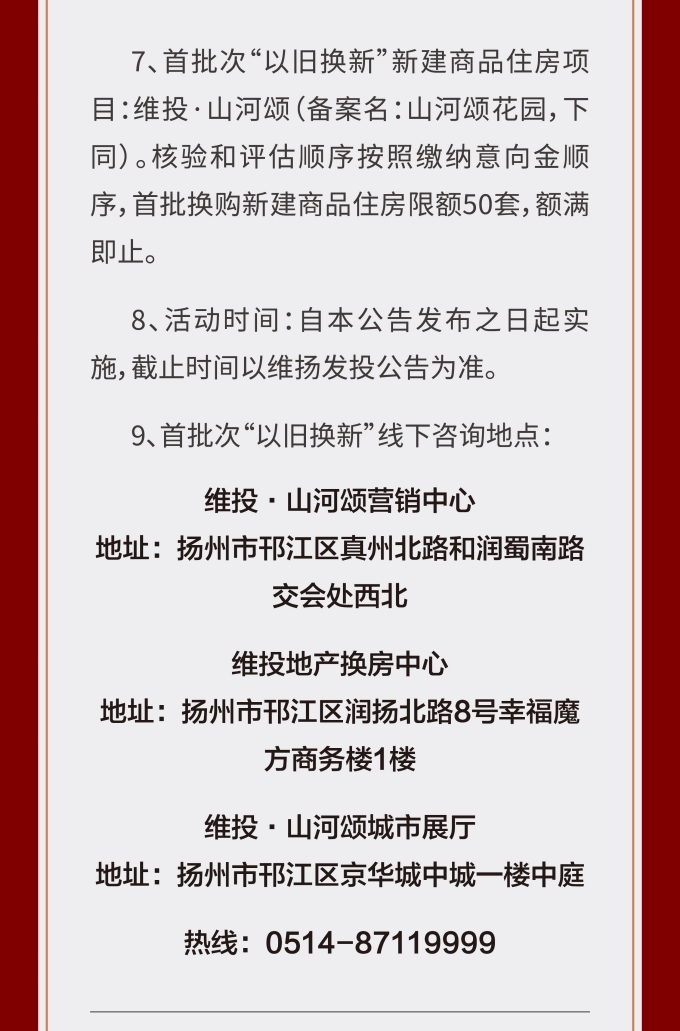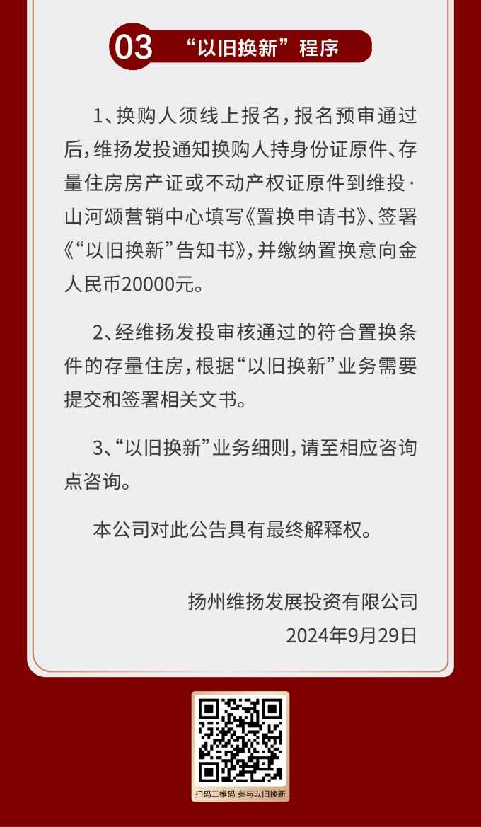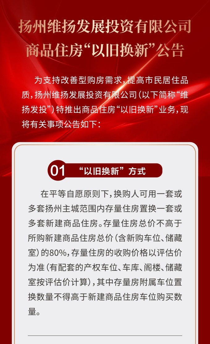 住房“以舊換新”“以房換房”是各地房地產(chǎn)新政中以“小細(xì)節(jié)”撬動“大市場”的重要舉措。維揚發(fā)投積極響應(yīng)政府新推行的“以舊換新”政策,踐行“惠民”理念,整合各項資源,搭建換房中心平臺,為買房人提供一站式以舊換新置換服務(wù),推動激活邗江區(qū)商品房市場活力。 此次維揚發(fā)投“以舊換新”工作以其自主開發(fā)的維投·山河頌項目為試點,由國企背書、置換范圍廣、全流程專業(yè)服務(wù)。首批換購新建商品住房限額50套,換購人可通過登錄“維揚發(fā)投商品住房‘以舊換新’線上報名系統(tǒng)”報名,具體要求詳見公告。